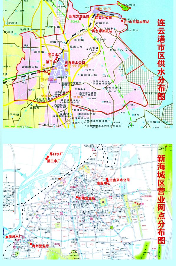 經過多年的不斷建設, 連云港市自來水有限責任公司已形成了自來水的生產與供應、給排水工程設計、管道安裝與維修、水質檢測、給排水自動化控制與安裝等完整的供水體系,下設海州水廠、茅口水廠和第三水廠3座制水廠以及新海營業所、新海管線所、連云供水分公司、材料供應站、水質檢測中心、源通市政工程公司等二級單位和投資單位。公司日供水能力40萬立方米(深度處理能力30萬立方米),供水區域面積1200平方公里,用水人口約120萬人。 2024年公司日均供水量38萬立方米, 最高日供水量43.58萬立方米,供水主干管網總長度1477公里,水質綜合合格率100%。