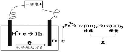 目前市場上有商家出售標榜能夠檢測水質的電解器,宣稱根據水電解后的顏色變化來判斷水質好壞。這些電解器通常有兩個電極,其中正極為鐵棒,負極為鋁棒,插入水中通電后,由于普通自來水為含有微量礦物質,使水可以導電,電極之間形成了一個電解池(如下圖所示)。