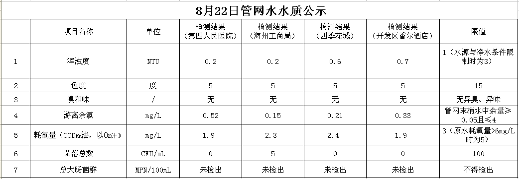 2016年8月22日管網(wǎng)水水質(zhì)公示