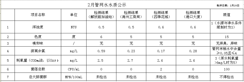 2017年2月管網(wǎng)水水質(zhì)公示