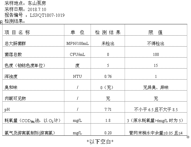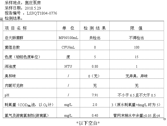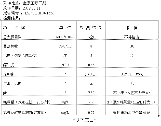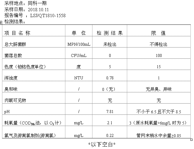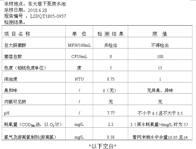 2018年10月份二次供水泵房水質公示