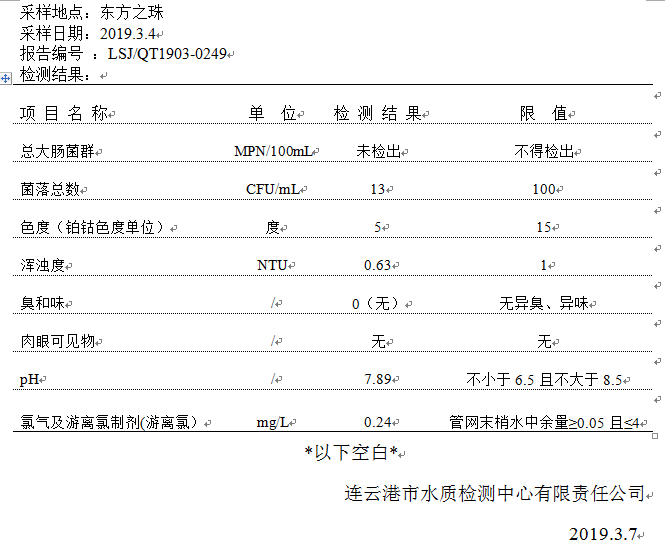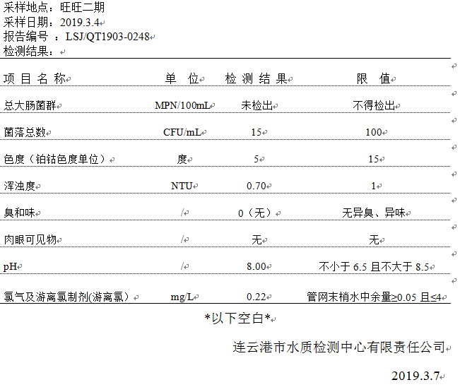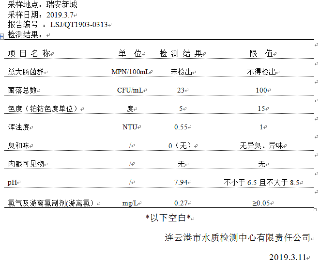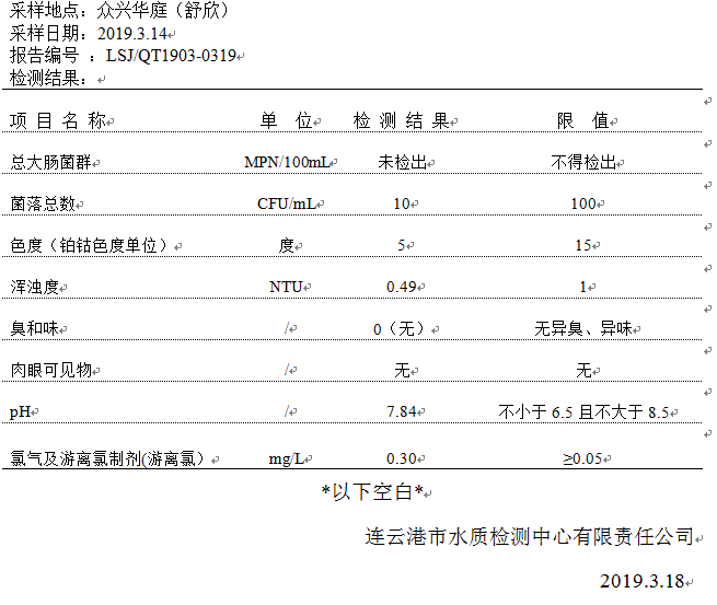 2019年3月二次供水泵房水質(zhì)公示