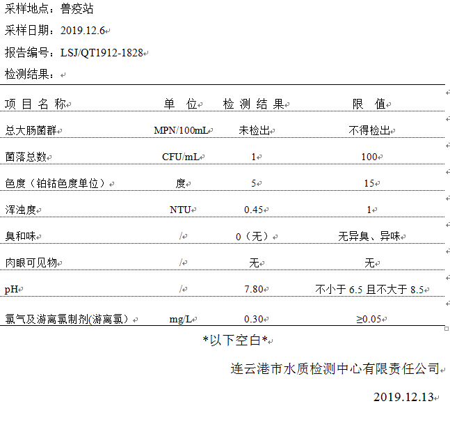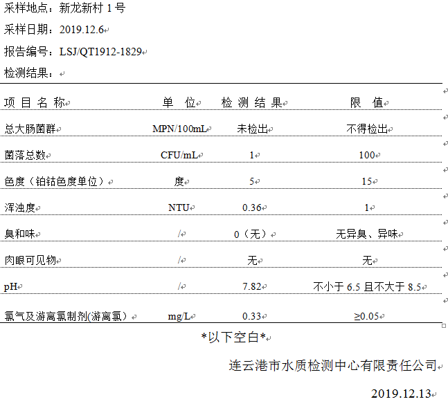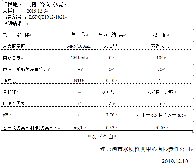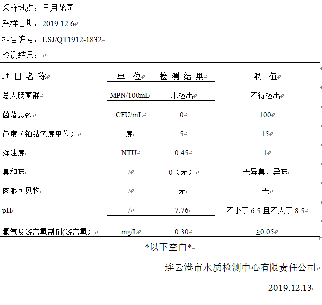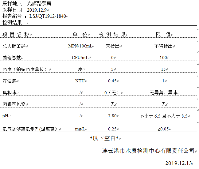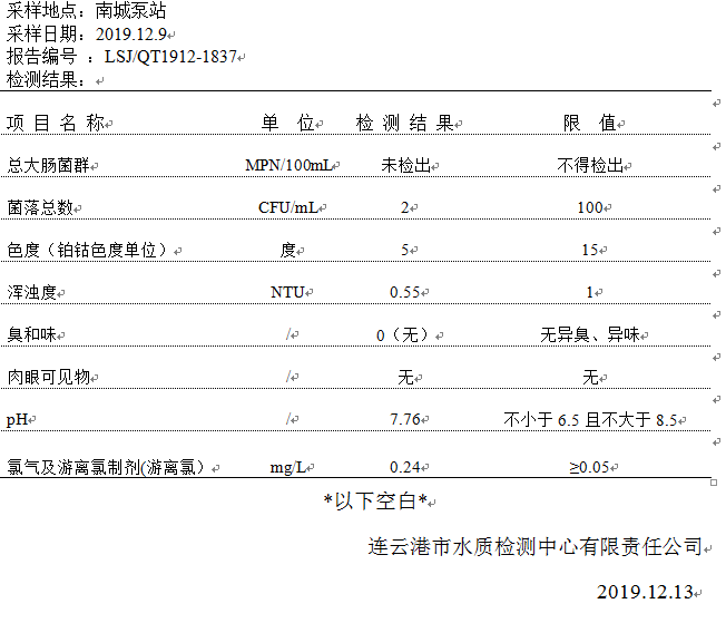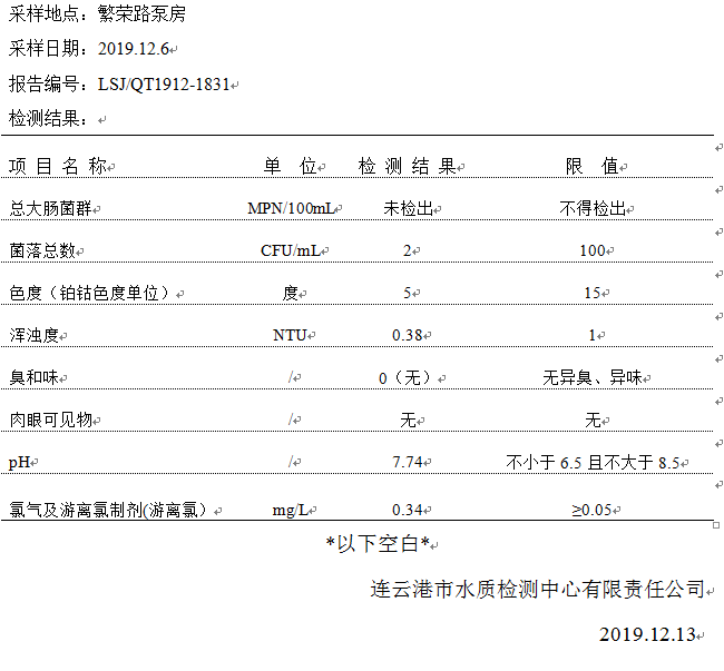 2019年12月二次供水泵房水質(zhì)公示
