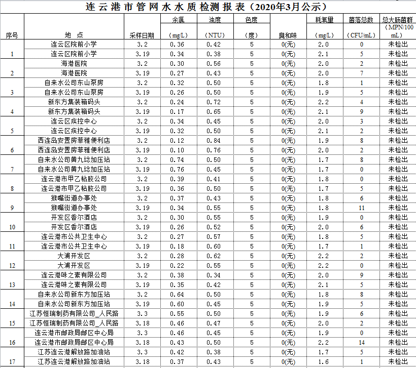 2020年3月管網水水質公示