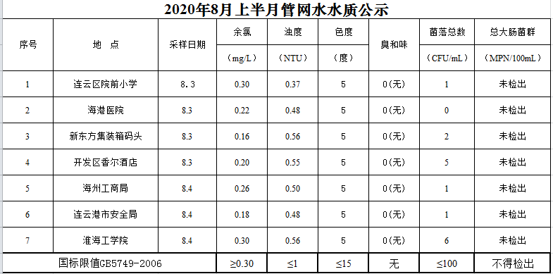 2020年8月上半月管網(wǎng)水水質(zhì)公示
