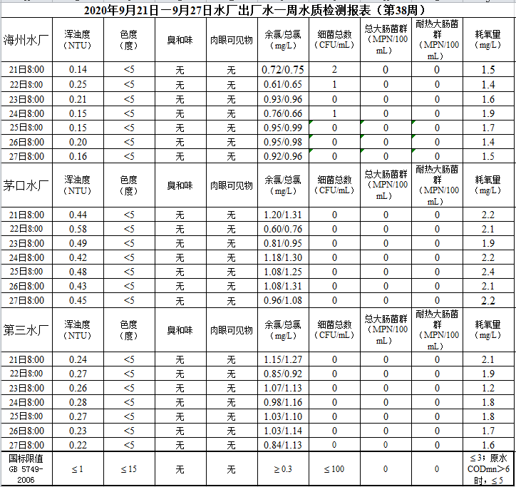 2020年9月21日—9月27日出廠水水質(zhì)公示