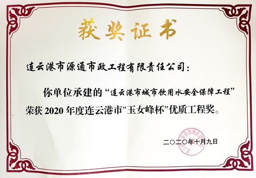 由源通承建的連云港市城市飲用水安全保障工程--海州水廠改造工程(區(qū)域供水水廠改造)低壓電氣及自控工程,于本月榮獲“2020年度連云港市玉女峰杯優(yōu)質(zhì)工程”獎(jiǎng)。