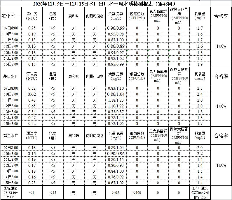 2020年11月9日—11月15日出廠水水質公示