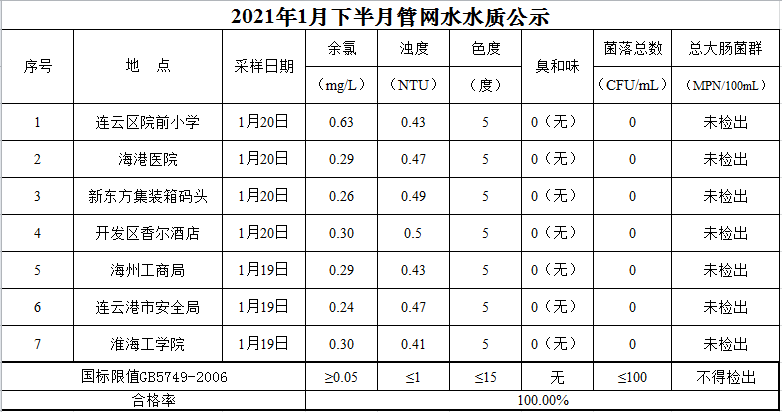 2021年1月下半月管網(wǎng)水水質(zhì)公示