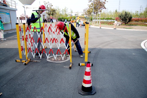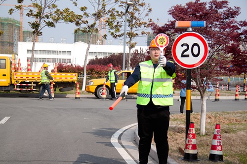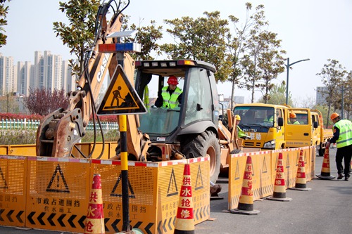 演練在新海管線所副所長楊蘇謙發(fā)令下拉開序幕,從接到報修指令后管線搶修班第一時間組織相關(guān)人員到達現(xiàn)場進行勘察,通過手機GIS系統(tǒng)確認信息并反饋至搶修班負責(zé)人,搶修班負責(zé)人按指令迅速組織人員、材料、車輛等趕赴現(xiàn)場。到達現(xiàn)場后,首先依據(jù)作業(yè)條件、環(huán)境進行風(fēng)險評估,通過評估分別在車輛行駛側(cè)設(shè)置限速指示牌、施工導(dǎo)向指示牌、安全警示爆閃燈,施工作業(yè)范圍全封閉圍擋并在各路口設(shè)置專人交通疏導(dǎo);其次現(xiàn)場設(shè)置維修作業(yè)帳篷,搶修材料堆放,在顯眼位置張貼搶修公告;最后現(xiàn)場安全員對確定的搶修方案技術(shù)安全交底,作業(yè)機械進入全封閉現(xiàn)場模擬作業(yè)。