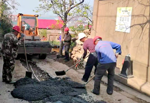 程老太的院墻外,曲折的李庵路上,一輛鏟車拖著半車斗混凝土剛剛駛來,數名施工人員就忙成了一片,濃稠的混凝土被傾倒至路心坑道,一名工人拿起了震動棒,幾名瓦工則忙于攤勻找平,鋪好的自來水主管道就淹沒在混凝土中。