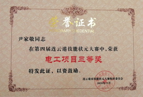 本次大賽由市政府主辦,市委組織部、宣傳部、市人社局等11個部門共同承辦,江蘇省經貿技師學院和連云港中等專業學校協辦。大賽共設置12個職業(工種),6000多人報名參賽,公司組隊參加了電工、化學檢驗員2個項目的比賽。在全體參賽選手和教練團隊的不懈努力和辛勤付出下,公司選派的尹家敬、楊燁、莊新照3名青年職工脫穎而出,繼張超在第三屆全市技能狀元大賽上獲獎后,再次取得優異成績。根據表彰文件,尹家敬被授予“連云港市技能標兵”、“連云港市五一創新能手”、“連云港市青年崗位能手”榮譽稱號,獎勵5000元。