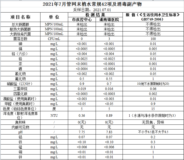 2021年7月管網水水質公示