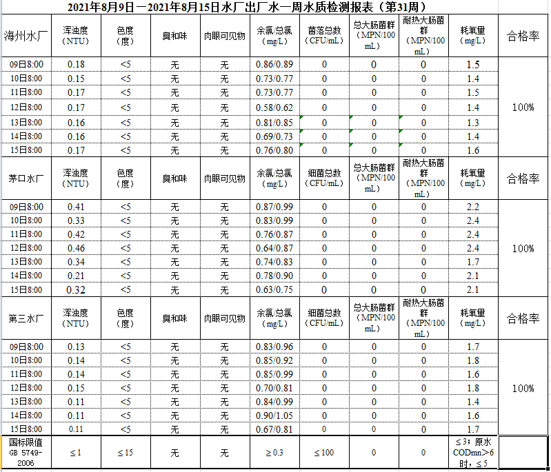 2021年8月9日—8月15日出廠水水質(zhì)公示