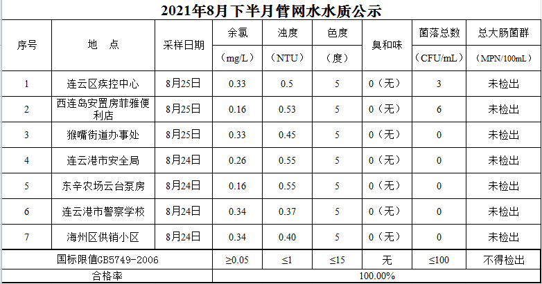 2021年8月下半月管網水水質公示