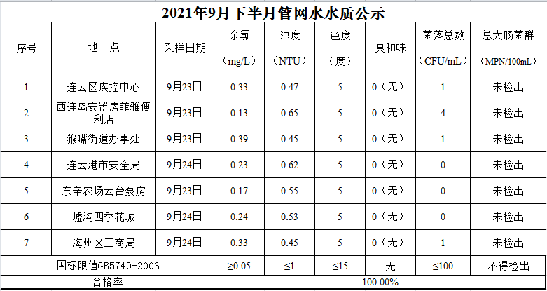 2021年9月下半月管網(wǎng)水水質(zhì)公示
