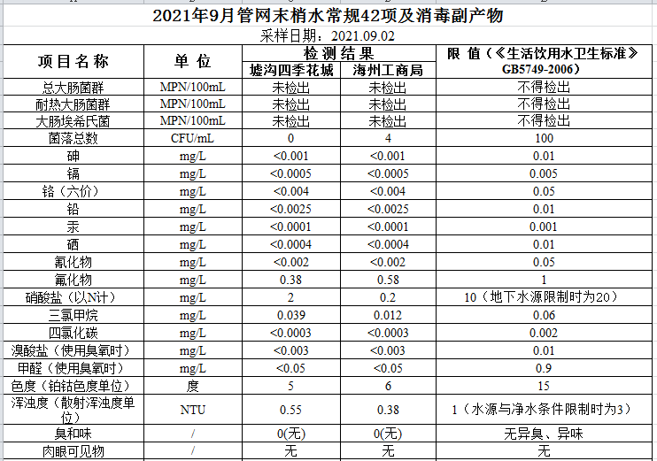 2021年9月管網水水質公示