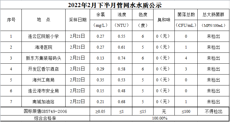 2022年2月下半月管網水水質公示