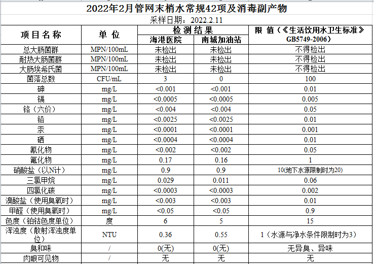 2022年2月份管網水水質公示