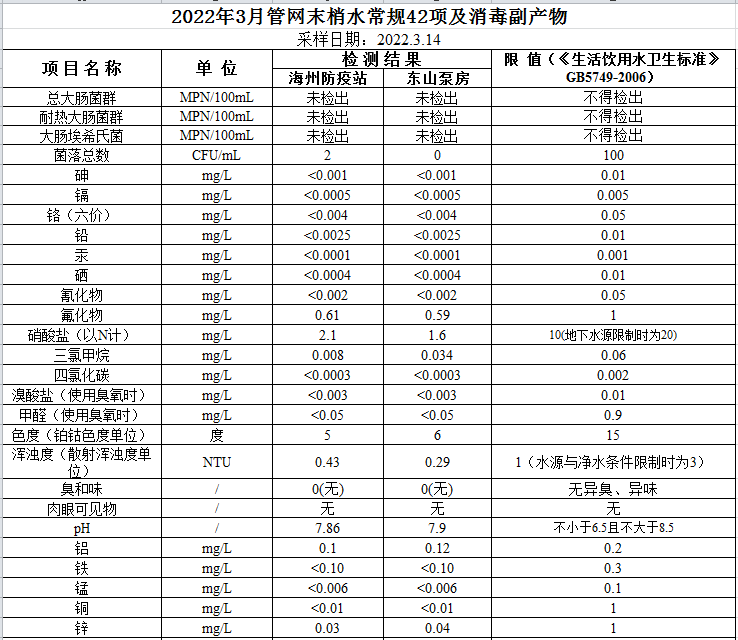 2022年3月份管網(wǎng)水水質(zhì)公示