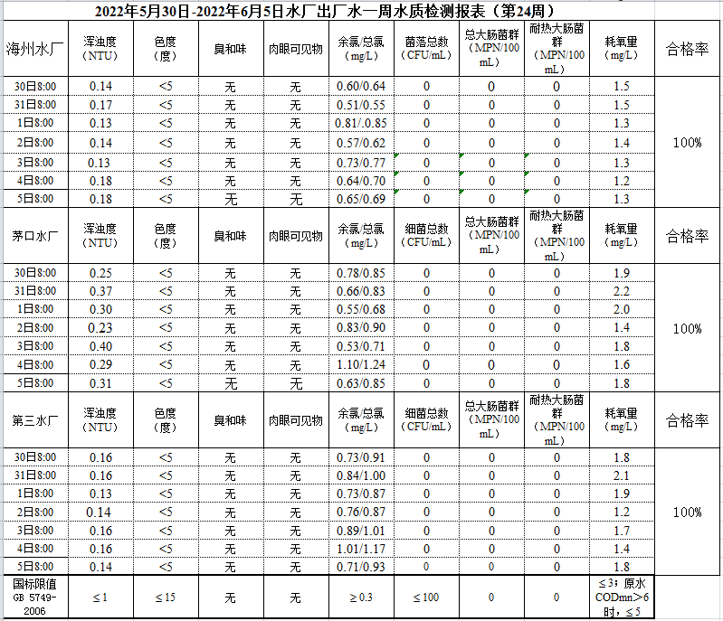 2022年5月30日—6月5日出廠水水質公示