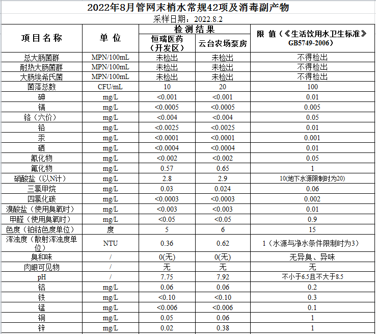 2022年8月份管網水水質公示