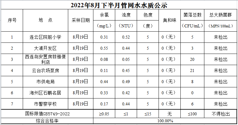 2022年8月下半月管網(wǎng)水水質(zhì)公示
