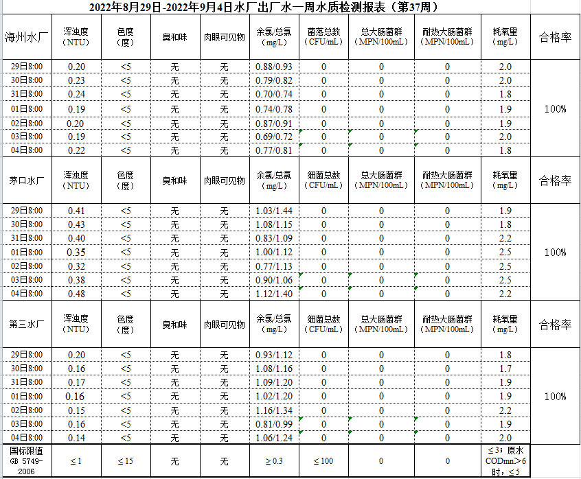 2022年8月29日—9月4出廠水水質(zhì)公示