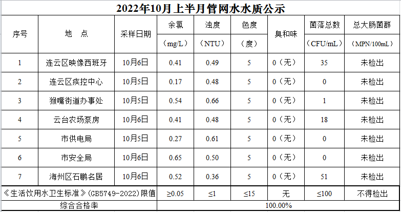 2022年10月上半月管網(wǎng)水水質(zhì)公示