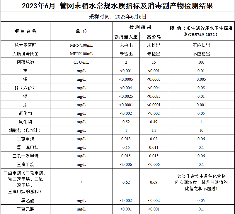 2023年6月份管網水水質公示