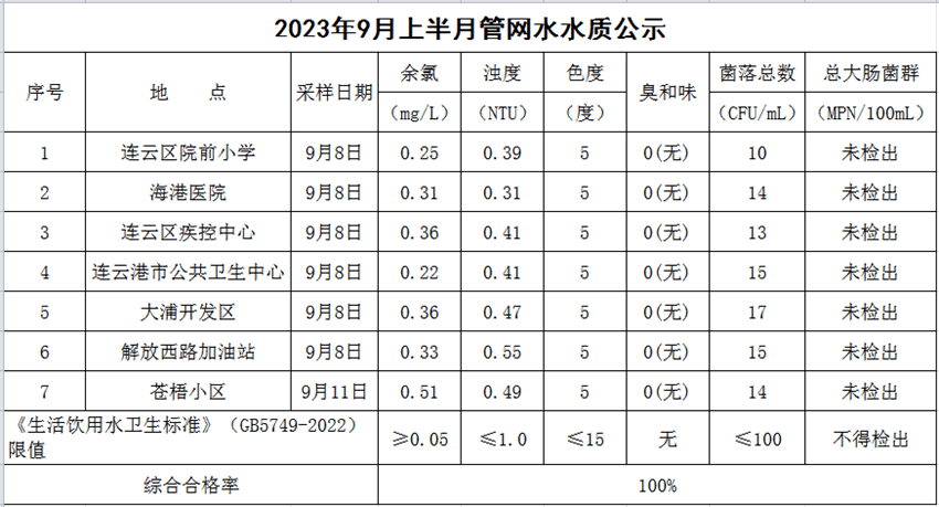 2023年9月上半月管網水水質公示