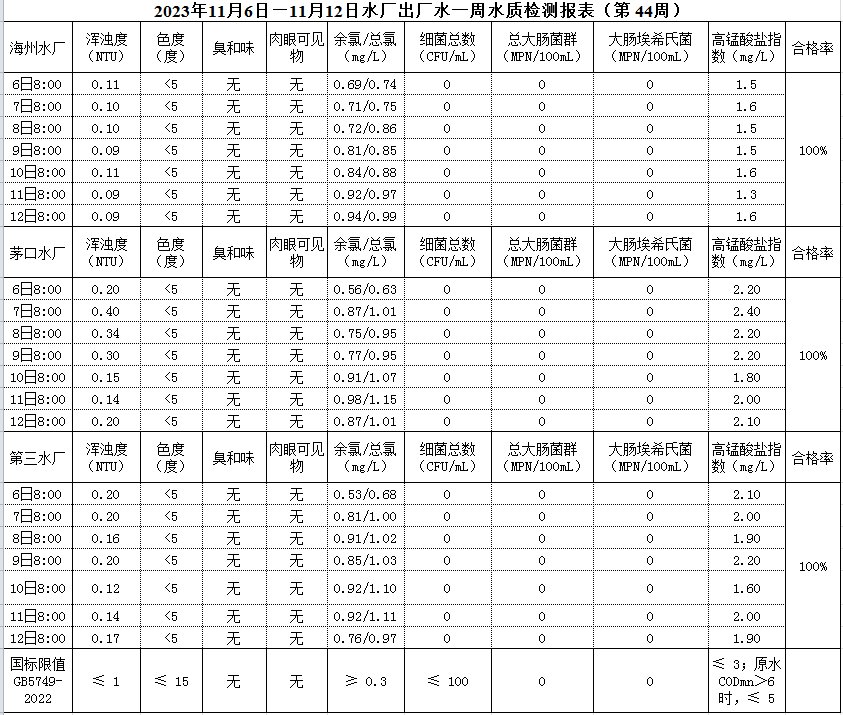 2023年11月6日—11月12日出廠水水質(zhì)公示
