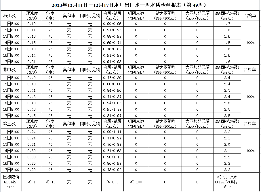 2023年12月11日—12月17日出廠水水質(zhì)公示
