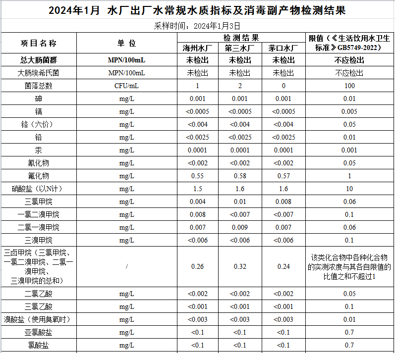 2024年1月份出廠水水質公示