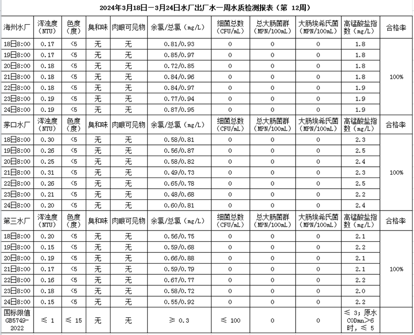 2024年3月18日—3月24日出廠水水質公示