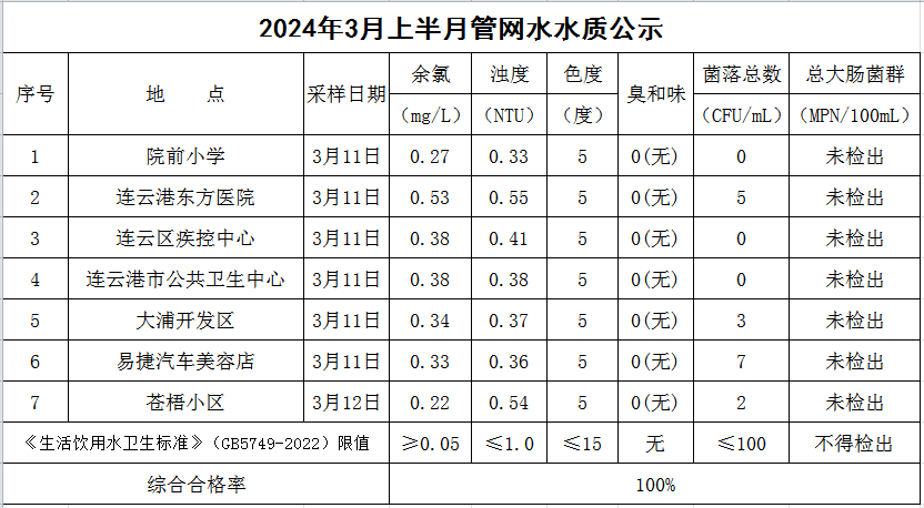 2024年3月上半月管網水水質公示