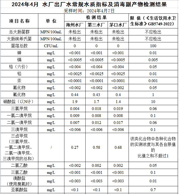 2024年4月份出廠水水質公示
