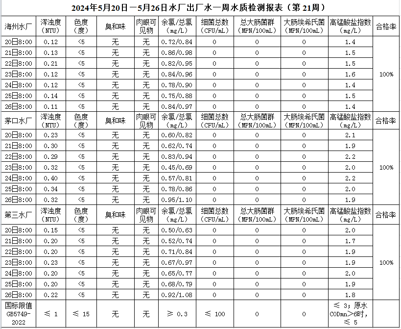 2024年5月20日—5月26日出廠水水質(zhì)公示