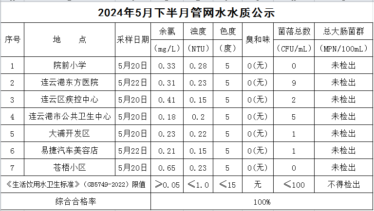 2024年5月下半月管網(wǎng)水水質(zhì)公示