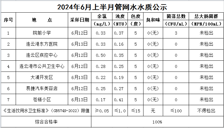 2024年6月上半月管網水水質公示
