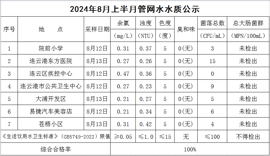 2024年8月上半月管網(wǎng)水水質(zhì)公示