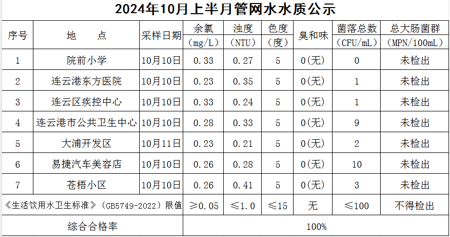 2024年10月上半月管網(wǎng)水水質(zhì)公示