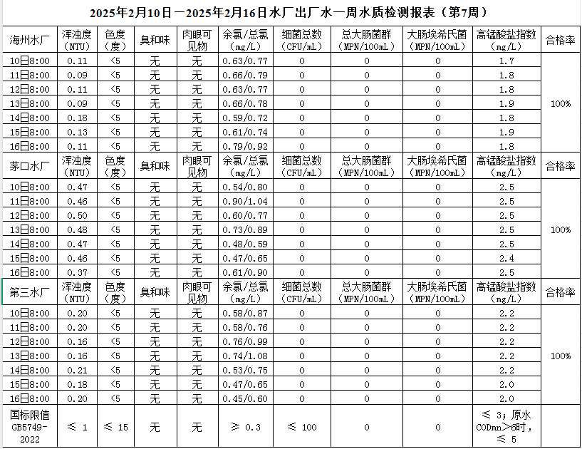 2025年2月10日——2月16日出廠水水質(zhì)公示