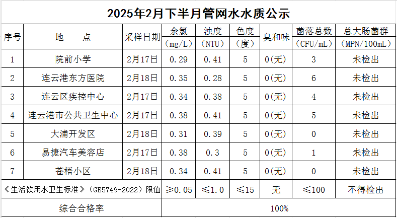2025年2月下半月管網(wǎng)水水質(zhì)公司