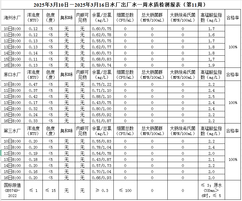 2025年3月10日——3月16日出廠水水質(zhì)公示