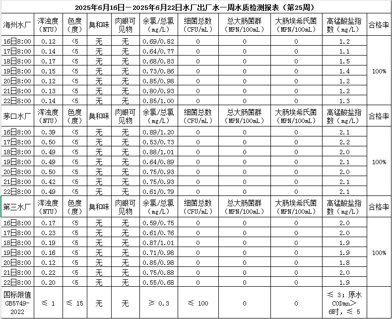 2025年6月16日——6月22日出廠水水質(zhì)公示