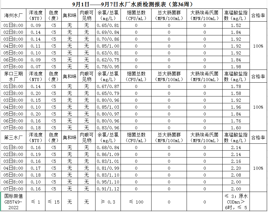 2025年9月1日——9月7日出廠水水質公示