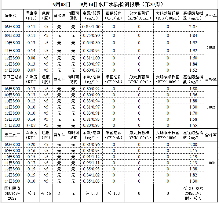 2025年9月8日——9月14日出廠水水質(zhì)公示